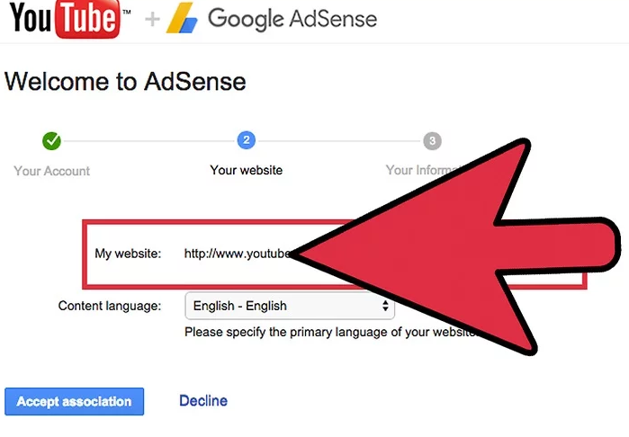2) Next, enter your google account and the URL of your channel. Describe your content, fill in the details like cell number, street address etc and click on Accept Association button.