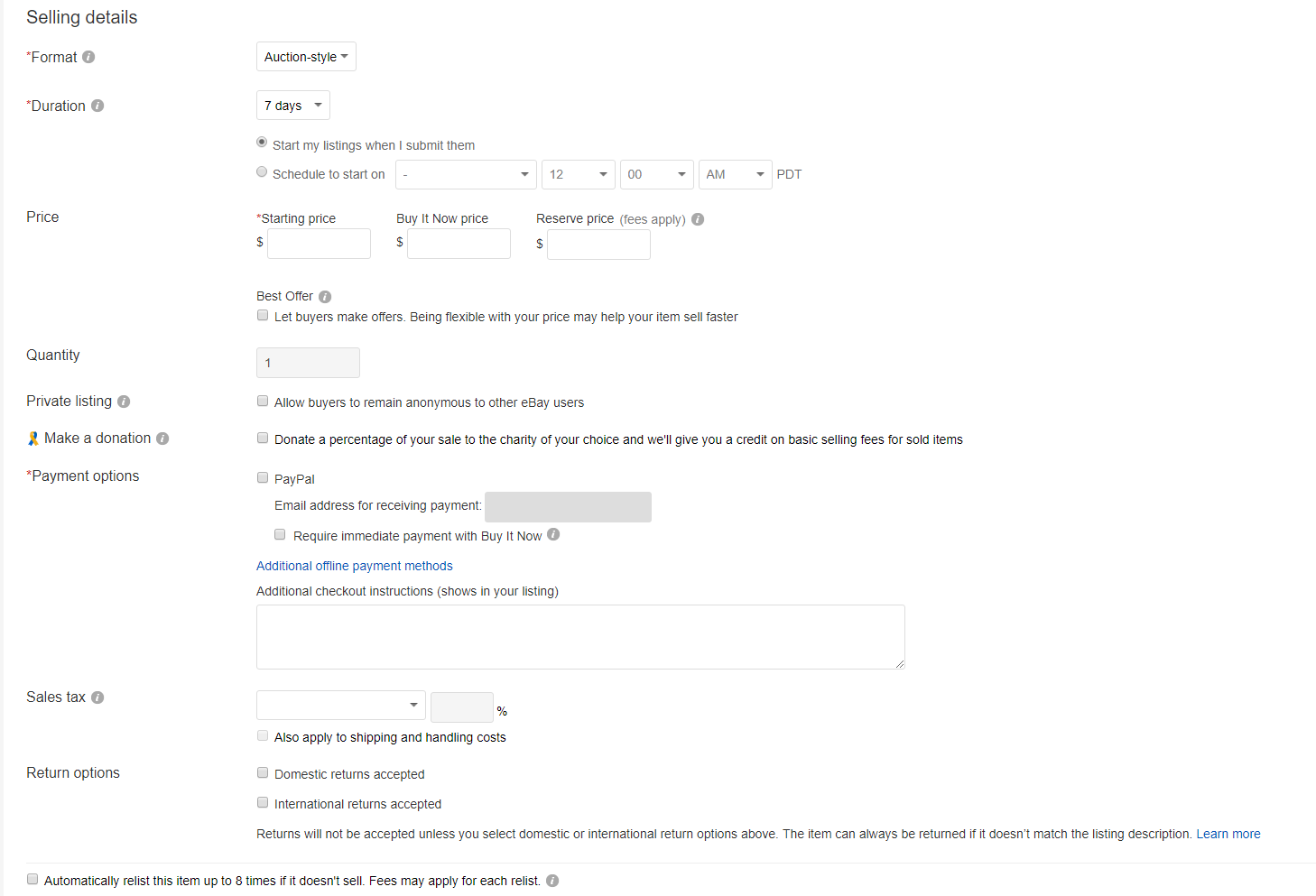 5) Set selling details. Here you have the option to choose whether you wan to sell an item in an auction style or for a fixed price. If you choose auction style, you will have to set a duration for the auction. If you choose to sell for a fixed price, select when to start the listing – as soon as application is submitted or on a specific time. In auction style you also have the option to put starting price, reserved price or “Buy It Now” price.